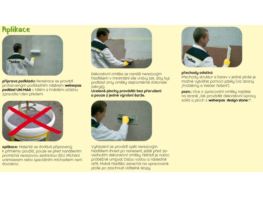 - K penetraci podkladu se používá probarvený podkladní nátěr weberpas podklad UNI MAR v odpovídajícím odstínu
