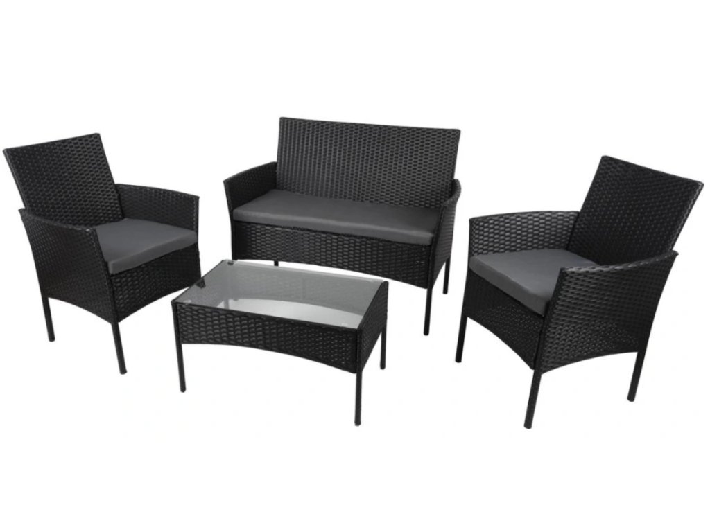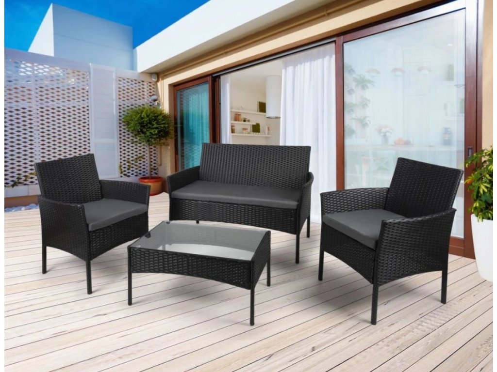 Zahradní nábytek ve 4 dílech v elegantním černém ratanu. Ideální pro venkovní odpočinek na vaší zahradě, balkóně nebo terase. Povětrnostně odolný ratan zajišťuje trvanlivost a dlouhou životnost v různých klimatech.