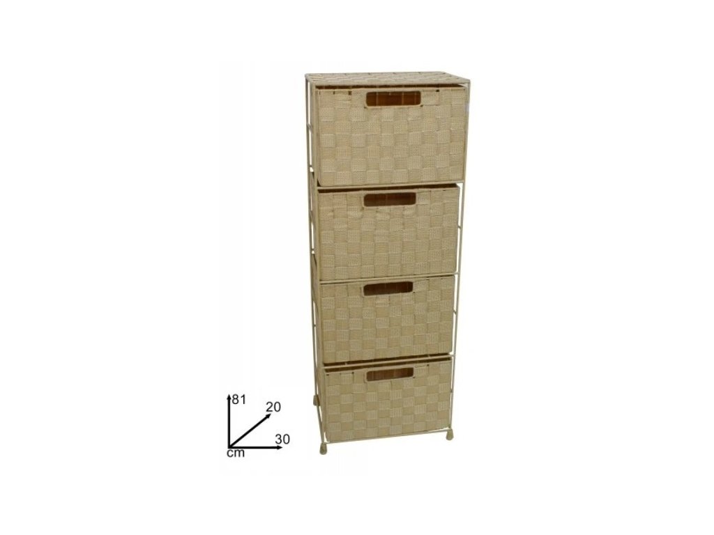 Nylonová komoda se 4 výsuvnými zásuvky bude nejen potřebná na uschování spousty drobností jak v ložnici, pracovně, obýváku nebo třeba v dětském pokoji. Komoda má ocelovou stabilní konstrukci ve které jsou umístěné ocelové zásuvky potažené nylonovým výpletem. Každá zásuvka má praktické madlo pro snadné vysunutí. Rozměr komody - výška 81 cm, šířka 30 cm a hloubka 22cm, rozměr zásuvek - šířka 29 cm, výška 19 cm a hloubka 20 cm