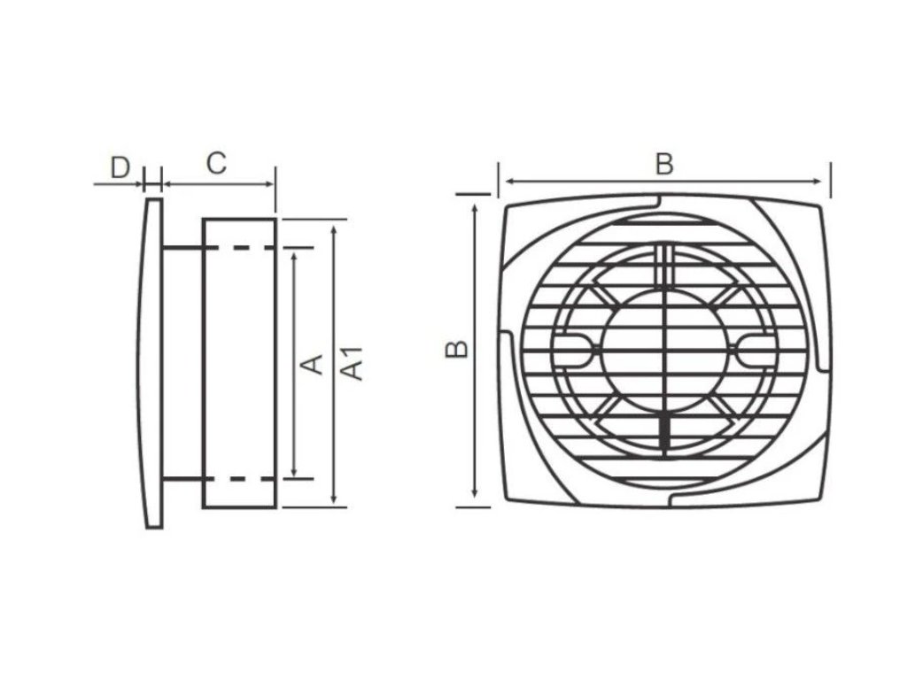 (ventilátor je primárně konstruovaný pro potrubí A = Ø120 mm (vývod), ale díky většímu osazení (A1 = 150 mm) lze ventilátor namontovat i do stavebního otvoru Ø150 mm, kde ho přidrží čelní kryt) - B = 170 mm
