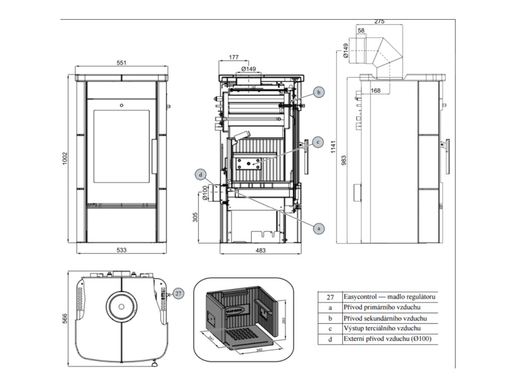Kamna ALYTUS o výkonu 10,2 kW jsou vyrobena z kvalitního 2-5 mm ocelového plechu, lakována speciálním žáruvzdorným lakem, který odolává vysokým teplotám. Díky kachlovému obkladu bude teplo z kamen sálat ještě dlouho po vyhasnutí ohně. Ohniště je vyloženo žárobetonovým roštem, který má vyšší životnost a zajišťuje také lepší parametry spalování. Uchvátí vás svým luxusním provedením a speciálním velkoplošným sklem, které je schopno odolávat teplotám až 800 stupňů C a které zaručuje nádherný zážitek z pohledu na plápolající oheň. Krbová kamna se vyznačují vysokou účinností 78,9 %. Poskytují ekonomické vytápění při malé spotřebě paliva. Tato kamna mají terciární spalování, externí přívod vzduchu, uzavíratelný přívod vzduchu a funkci Easy control. Terciární spalování - je přívod vysoce předehřátého vzduchu do spalovací komory, který velmi napomáhá kvalitnějšímu spalování zplodin, snižuje obsah škodlivin ve spalinách a zvyšuje účinnost kamen. Externí přívod vzduchu (CPV) - jedná se o přívod vzduchu z venkovních prostor. Nedochází tedy ke spalování kyslíku z obytné místnosti. Vhodný pro dobře izolované prostory. Easy control – ovládání všech tří přívodů vzduchu – primárního, sekundárního, terciárního – pouze pomocí jednoho ergonomicky komfortního regulátoru. Profitujete díky dokonalému spalování šetřícím náklady. Uzavíratelný přívod centrálního vzduchu – v době mimo provoz. Pokud v kamnech zrovna netopíte, může být uzavřen centrální přívod vzduchu, čímž nedochází ke ztrátě ohřátého vzduchu z místnosti skrz kamna.