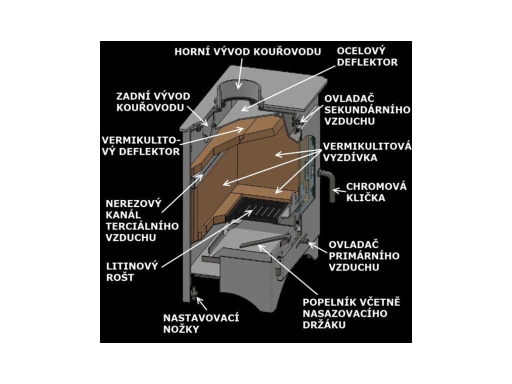 2. Dobrá účinnost a ekonomické topení — Spalování je navrženo tak, aby bylo účinné a efektivní, s použitím systémů jako trojí přívod vzduchu a spalování dřevoplynů, což pomáhá snížit spotřebu paliva a optimalizovat teplo.