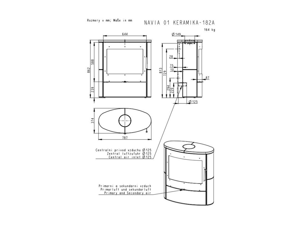 Krbová kamna ROMOTOP NAVIA 01 jsou kombinací ocelového plechu a keramických kachlí. Účinnost kamen je 83,58 %. Jmenovitý výkon 6 kW, regulovatelný výkon 3-7,8 kW. Krbová kamna jsou vhodná i pro nízkoenergetické domy. Kamna vynikají krásným designem. Dvířka kamen jsou vyplněná velkoplošným sklem. Šamotovou vyzdívku topeniště doplňuje odolný litinový rošt. Primární i sekundární vzduch se ovládají jedním táhlem. Předehřátý sekundární vzduch zajišťuje čistotu skla. Centrální (externí) přívod vzduchu je samozřejmostí.