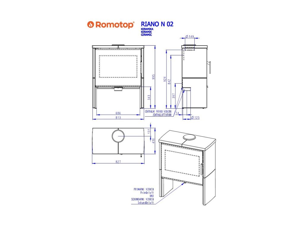 Kulatá krbová kamna ROMOTOP jsou vyrobená z kvalitní oceli. Účinnost kamen je 80,18 %. Jmenovitý výkon 6 kW, regulovatelný výkon 3-7,8 kW. Krbová kamna ROMOTOP RIANO N 02 vyrobená z kvalitní oceli a keramiky jsou vhodná i pro nízkoenergetické domy. Kamna vynikají krásným designem. Dvířka kamen jsou vyplněná velkoplošným sklem. Šamotovou vyzdívku topeniště doplňuje odolný litinový rošt. Primární i sekundární vzduch se ovládají jedním táhlem. Předehřátý sekundární vzduch zajišťuje čistotu skla. Centrální (externí) přívod vzduchu je samozřejmostí.