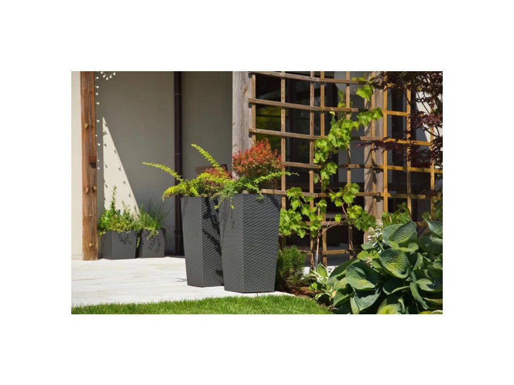 Květináč se strukturovaným designem, který působí velmi luxusně. Moderní vysoký plastový květináč FINEZIA - ratan s matným povrchem v grafitové barvě. Součástí tohoto květináče je vyjímatelná plastová vložka v černé barvě. Květináč je vhodný jak do interiéru, tak do exteriéru. Do černé plastové vložky je možné udělat otvor a přebytečná voda bude zachycena v plastovém obale.