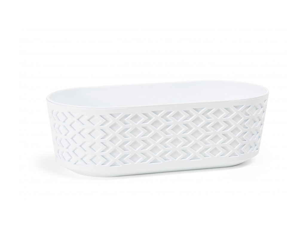Truhlík (vklad) i obal (děrovaný květináč) mají bílou barvu. Truhlík je odolný vůči běžným škrábancům.